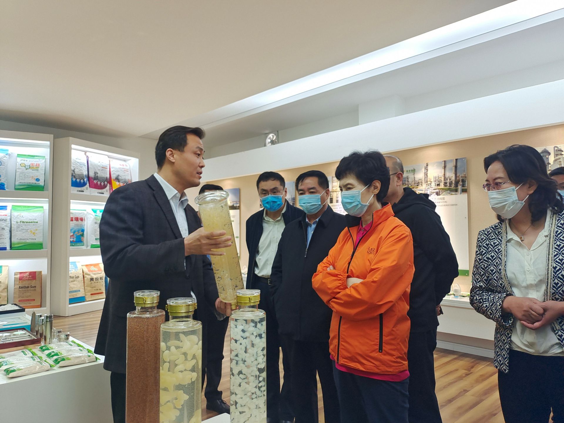 在公司展厅 , 高会长一行人认真听取了李总对于内蒙KOK在线登录官网-KOK(中国)公司的生产、经营情况以及国际贸易现状的介绍,了解了企业在开展对外贸易中存在的困难和问题。